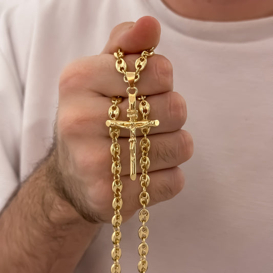 Cadena Tejido Gucci de Hombre de 62cm de 5mm + Cruz Cristo Madero Protección en Oro Laminado 18k con Garantía de por vida