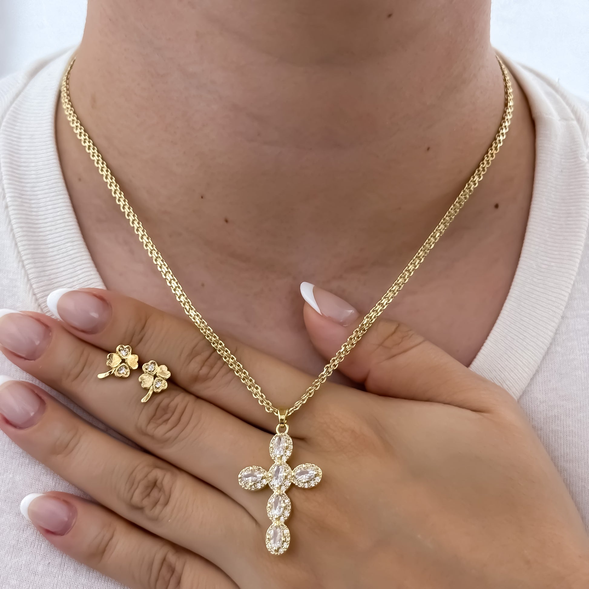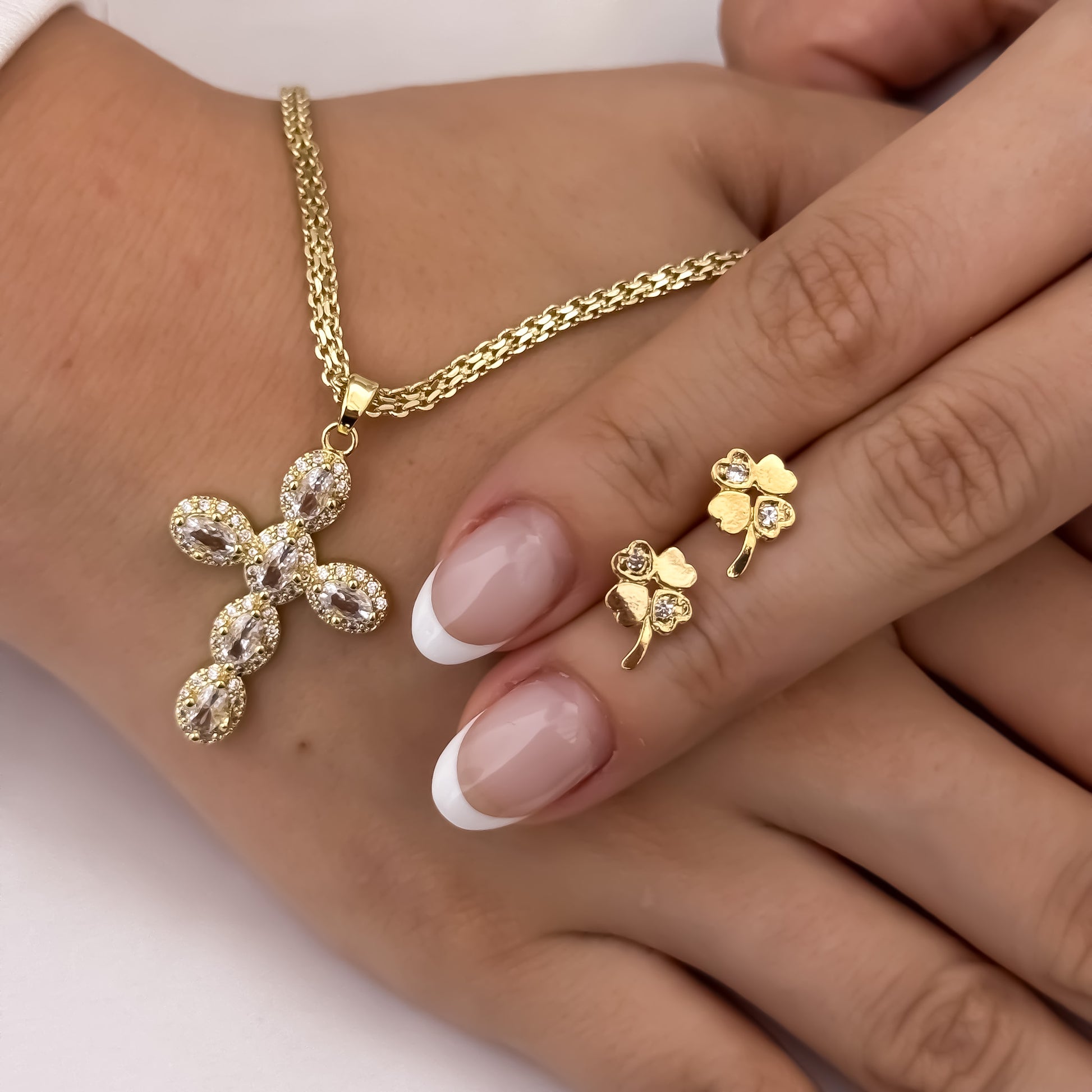 Dije de Cruz con Trébol – micro circones brillantes que simbolizan protección, fe y bendición. Topos en forma de Trébol – delicados, modernos y con micro circones de alta calidad. Todo fabricado en Oro Laminado 18K con 8 capas, con acabados de alta joyería que te harán destacar.