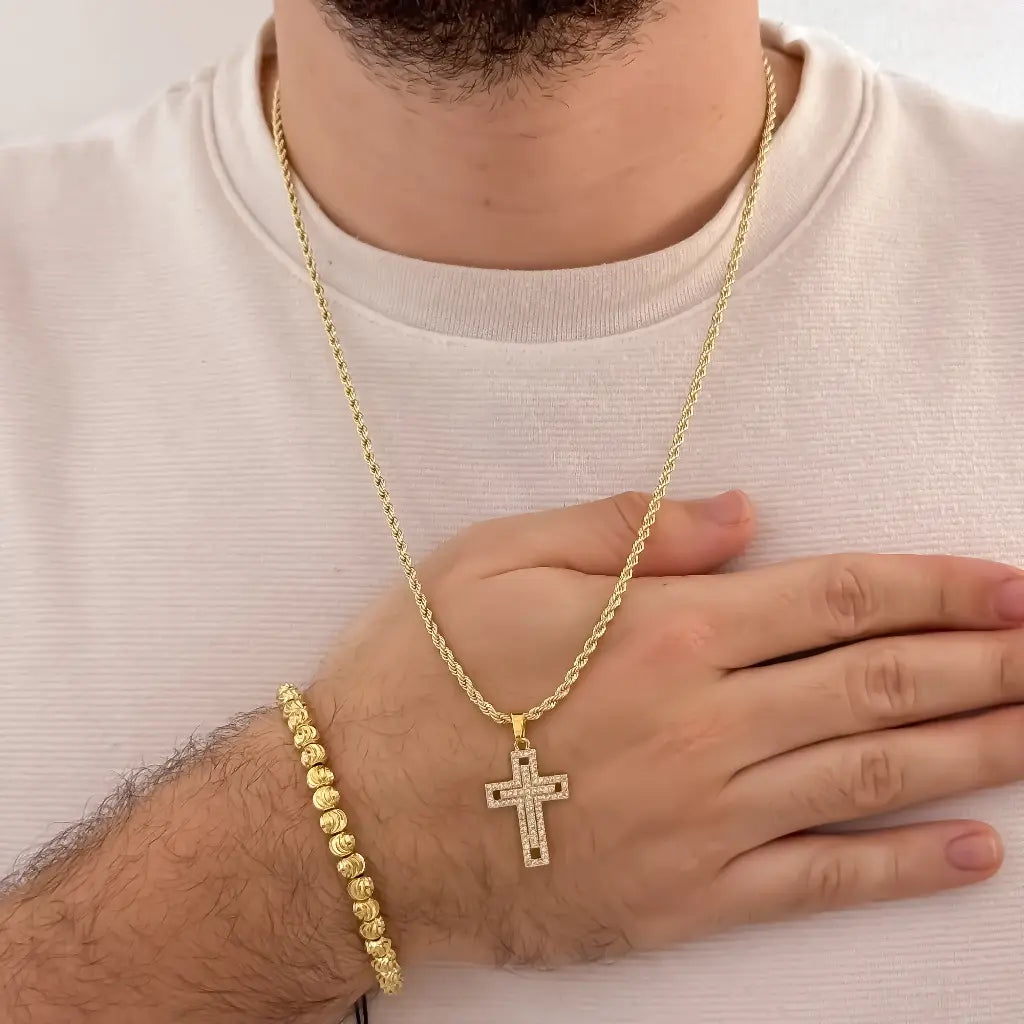 Conjunto De Caballero Con Cadena De Tejido Lazo, Dije De Cruz Cristal Y Manilla Italiana